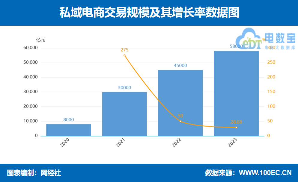 据网经社“电数宝”电商大数据库显示,2023年私域电商交易规模达到5.8万亿元,同比增长28.88%。