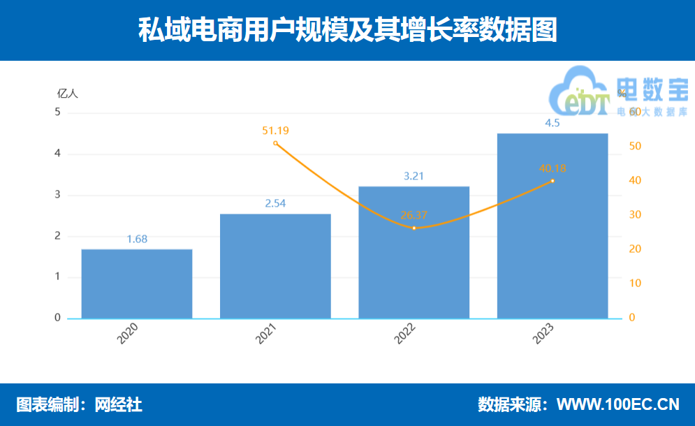 据“电数宝”电商大数据库显示,2023年私域电商用户规模达4.5亿人,同比增长40.18%,增速有所回升。