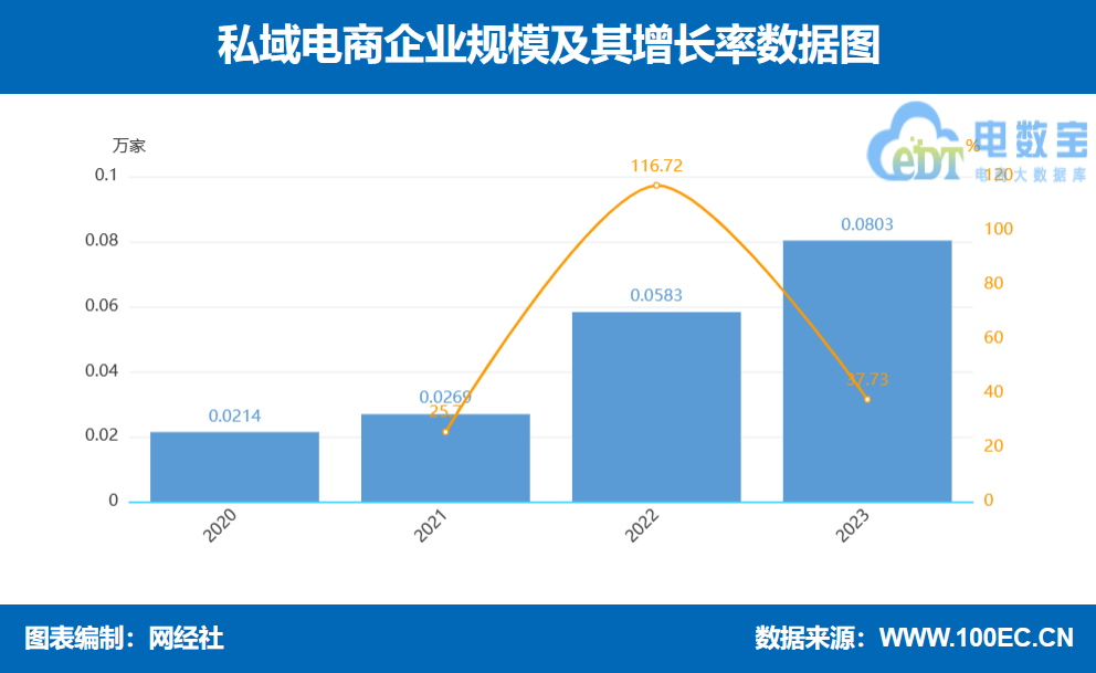 据“电数宝”电商大数据库显示,2023年私域电商行业企业规模达803家,同比增长37.73%,增速下滑。