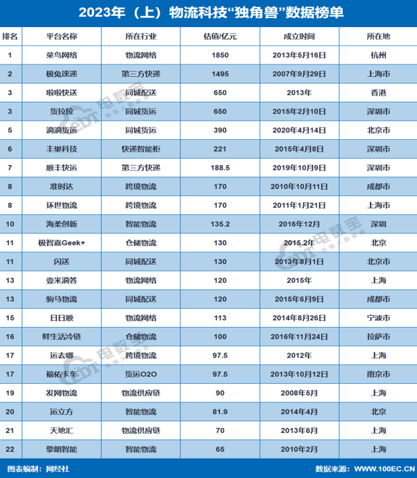 据“电数宝”(DATA.100EC.CN)显示,2023上半年,物流科技共有22家“独角兽”,总估值7134.6亿元。其中,菜鸟网络以1850亿元估值位列“独角兽”榜第一名。第2至22名分别为:极兔速递、啦啦快送、货拉拉、滴滴货运、丰巢科技、顺丰快运、准时达、环世物流、海柔创新、极智嘉Geek+、闪送、壹米滴答、驹马物流、日日顺、鲜生活冷链、运去哪、福佑卡车、发网物流、运立方、天地汇、擎朗智能。