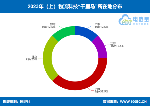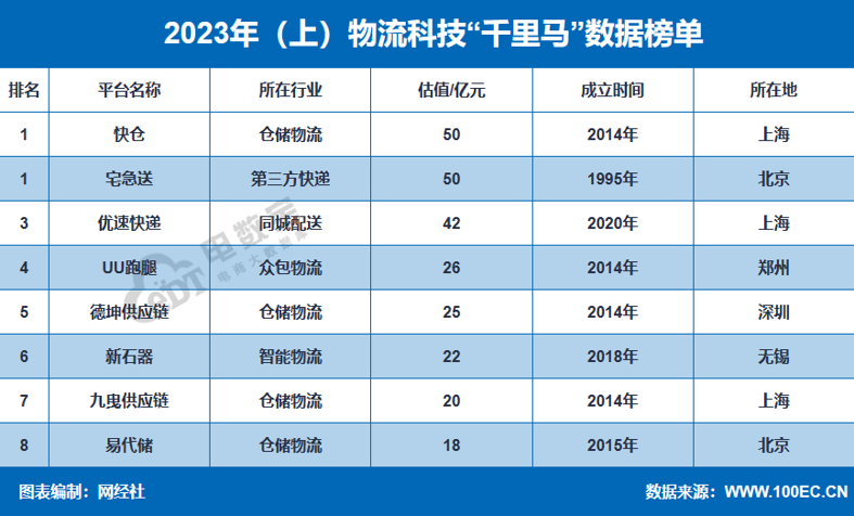 据“电数宝”(DATA.100EC.CN)显示,2023上半年,物流科技共有8家“千里马”,总估值253亿元。这八家企业分别是:快仓、宅急送、优速快递、UU跑腿、德坤供应链、新石器、九曳供应链、易代储。