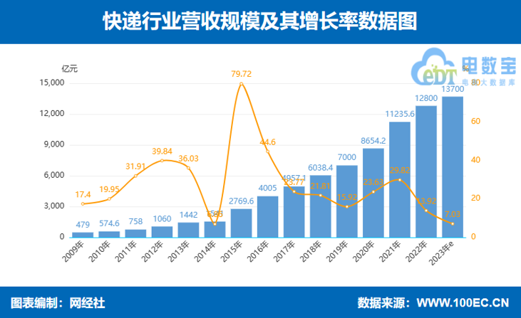 据“电数宝”数据显示,2023上半年快递行业营收规模约达6500亿元,预计全年为13700亿元,增速7.03%。