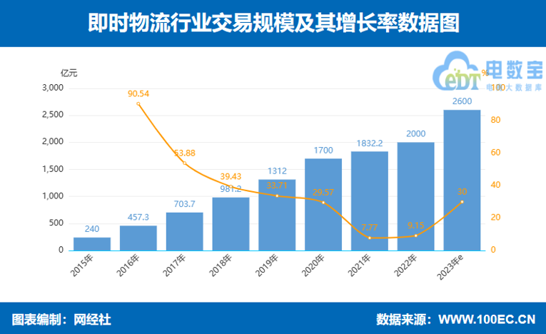 据“电数宝”数据显示,2023上半年即时物流市场规模约1300亿元,预计全年达到2600亿元,同比增长30%。
