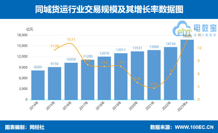 据“电数宝”数据显示,2023上半年同城货运市场规模约8000亿元,预计全年达16800亿元,同比增长14.02%。