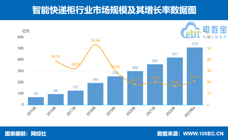 据“电数宝”数据显示,2023上半年年智能快递柜市场规模约为240亿元,全年预计达510亿元,同比增长21.14%。