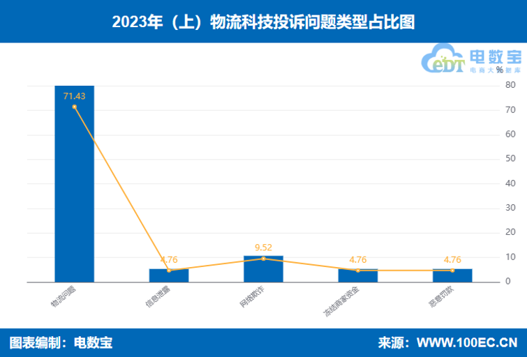 国内知名网络消费纠纷调解平台“电诉宝”受理用户维权案例显示, 2023上半年全国物流科技用户投诉问题类型主要包括:物流问题,占比高达71.43%,其余分别为信息泄露、网络欺诈、冻结商家资金、恶意罚款。