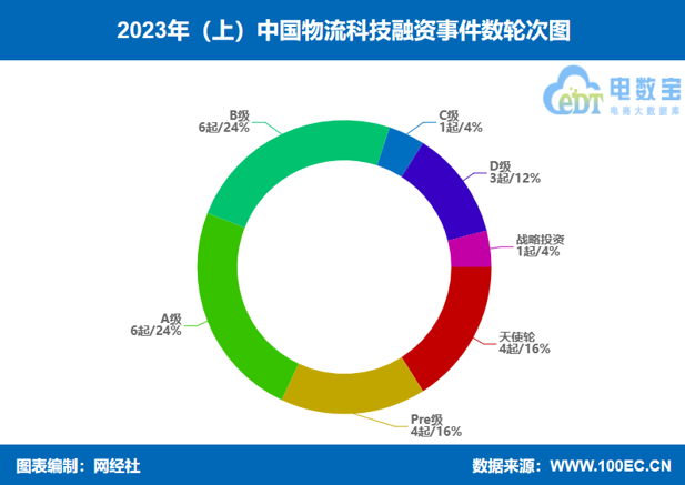 “电数宝”监测数据显示,2023上半年中国物流科技25起融资中,天使轮4起(1.45亿元)、Pre级4起(6000万元)、A级6起(3亿元)、B级6起(5亿元)、C级1起(2亿元)、D级3起(17.7亿元)、战略投资1起(3000万元)。单从金额来看,D轮融资金额最多,为15.7亿元。