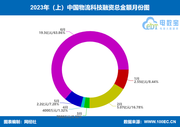 据“电数宝”监测数据显示,2023上半年物流科技融资事件数月份分布上,2月(6起)、4月(5起)、6月(5起)位列前三。此外,6月融资金融最多,为19.3亿;其次为2月(5.07亿),1月(2.55亿)、5月(2.2亿)、3月(7000万)、4月(4000万)。