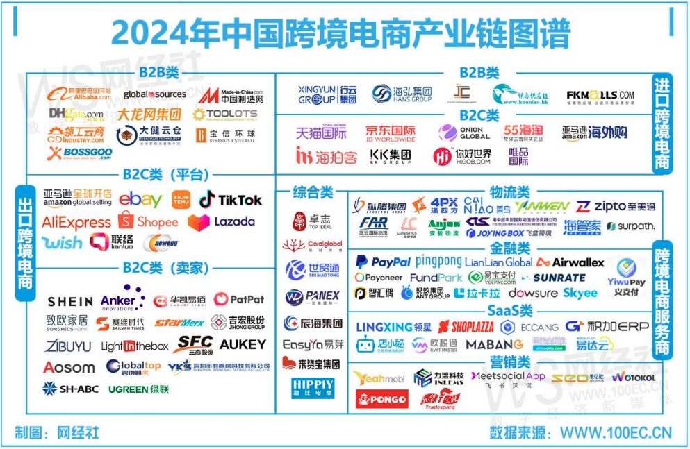 广义为电子商务在进出口贸易及零售 中的应用,包括:进出口跨境电商和 相关建站、SAAS、供应链、物流、海 外仓、支付、金融等服务商。