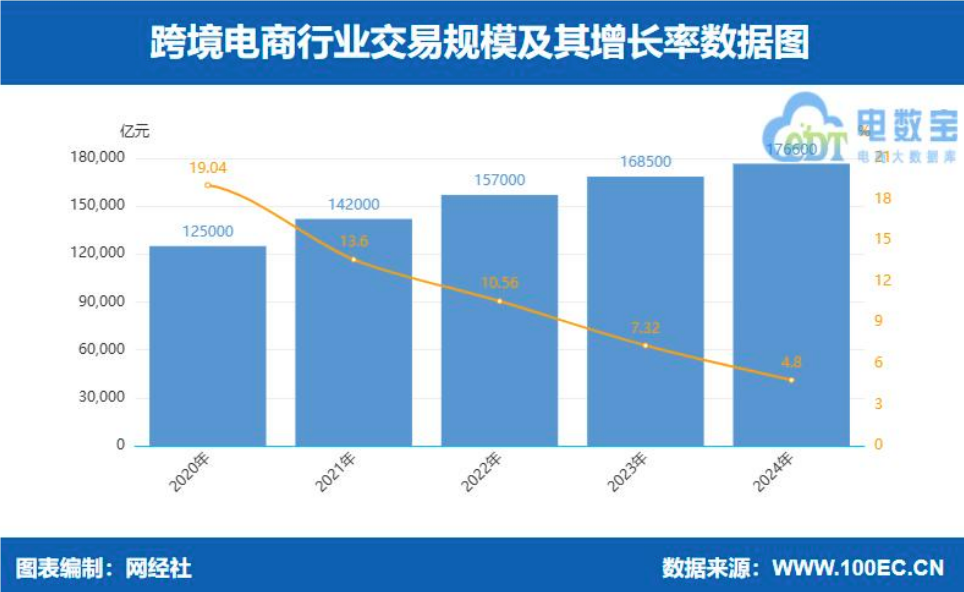 据“电数宝”电商大数据库显示,2024 年中国跨境电商交易额占我国货物贸易 进出口总值43.85万亿元的40.27%。