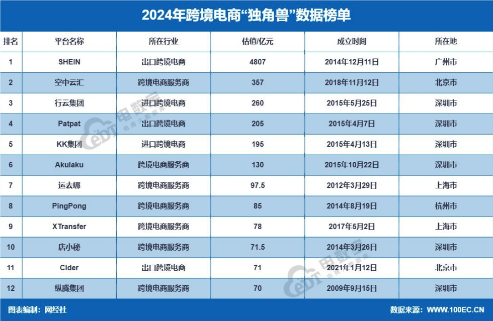 2024年跨境电商“独角兽”公司共12家,总估值达5853亿元(人民币),数量上与2023年的13家相比减少1家,估值上与2023年的6622亿元相比减少了769亿元,其中少的一家为连连数字,已经上市。