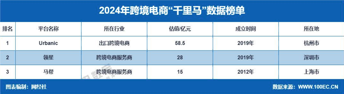 2024年跨境电商“千里马”公司共3家,总估值达101.5亿元(人民币),与2023年的274亿元相比增加了172.5亿元。数量上减少4家,减少的分别为越海全球、店匠科技、飞书深诺、欧税通。