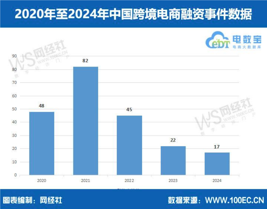 据“电数宝”电商大数据库显 示,2024年中国跨境电商企业 共发生17起融资,同比下降 22.73%。