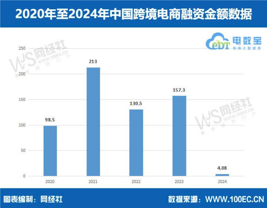 据“电数宝”电商大数据库显 示,2024年中国跨境电商企业 融资总额4.08亿元,同比减少 97.4%。