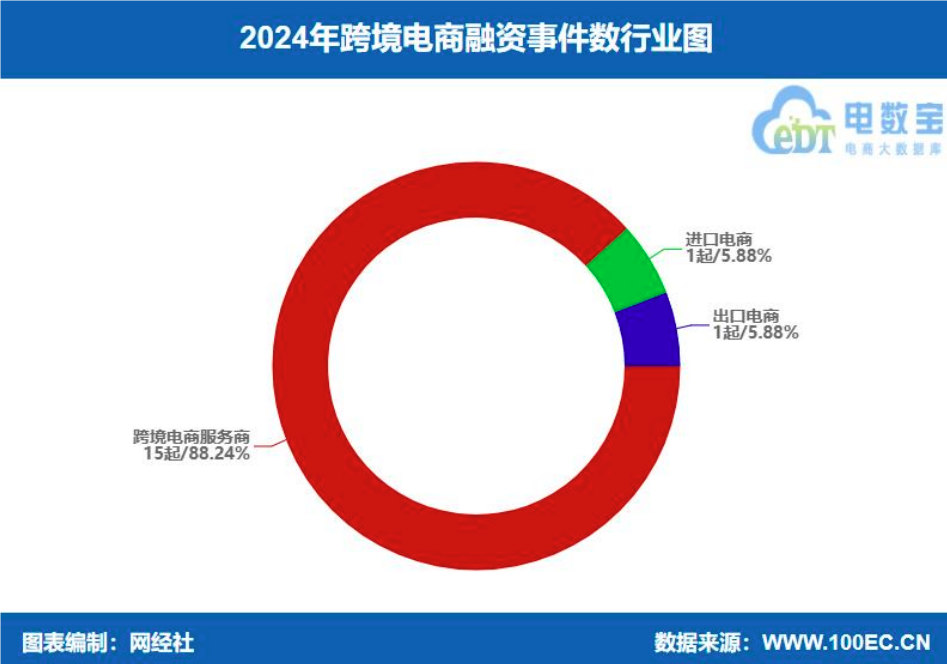 据“电数宝”电商大数据库显 示,2024年跨境电商融资事件 数行业分布上,跨境服务商最 多为15起(88.24%),其次是 出口电商1起(5.88%),进口 电商1起(5.88%)。