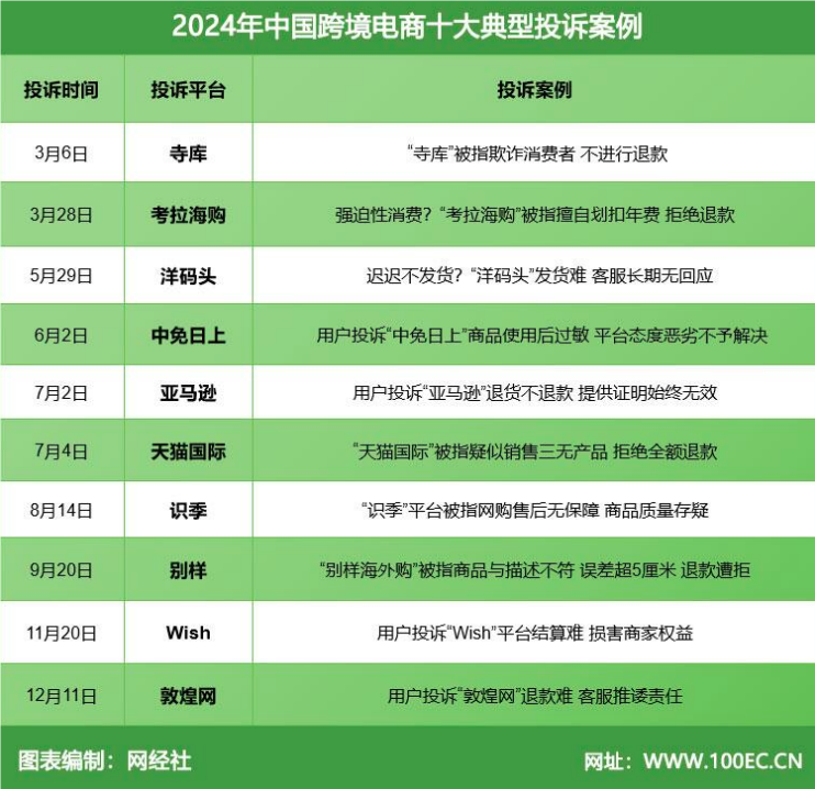 据国内知名网络消费纠纷调解 平台“电诉宝”数据显示, 2024年跨境电商领域十大典型 投诉案例,涉及寺库、考拉海 购、洋码头、中免日上、亚马 逊、天猫国际、识季、别样、 Wish、敦煌网。