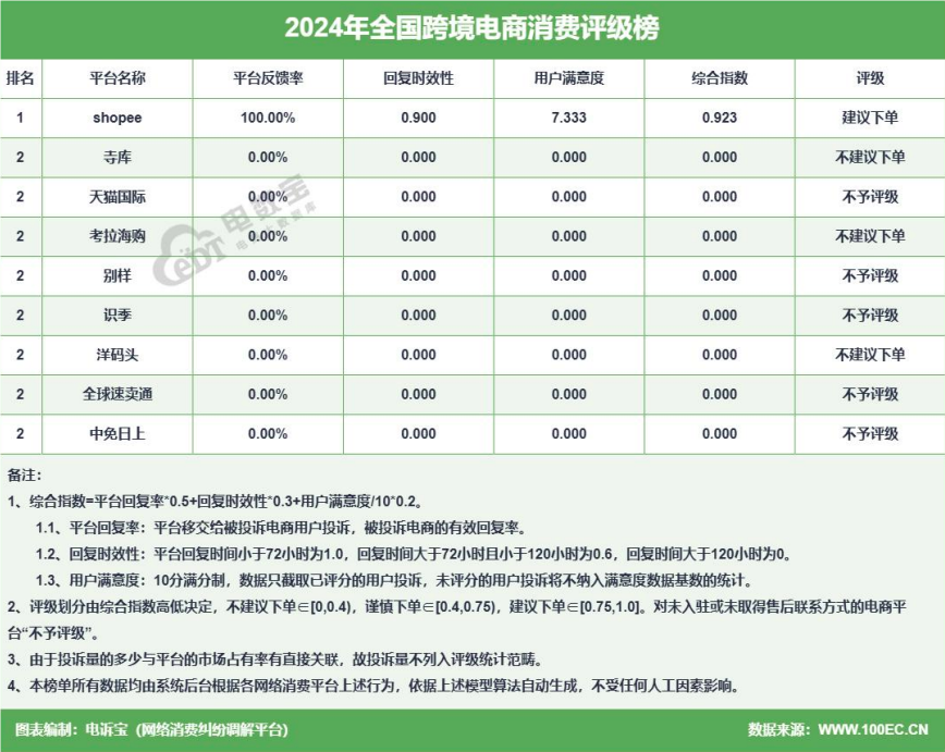 据国内知名网络消费纠纷调 解平台“电诉宝”数据显示, 在“2024年全国跨境电商消 费评级榜”中,寺库、考拉 海购、洋码头获“不建议下 单”评级;天猫国际、别样、 识季、全球速卖通、中免日 上获“不予评级”。