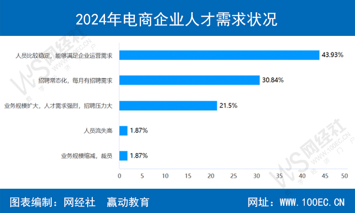 电子商务企业人才需求整体状况中,人员稳定以及招聘常态化的状态,占比达74.77%。业务规模扩大,人才需求旺盛的企业占比21.5%,比2023年的19%继续增长。