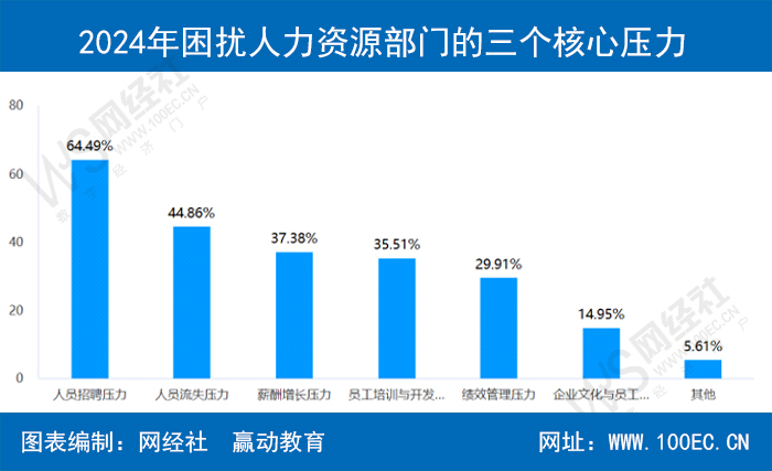被调查企业中显示,人员招聘压力、人员流失压力、薪酬增长压力是排名前三的因素,员工培训与研发占比下降。