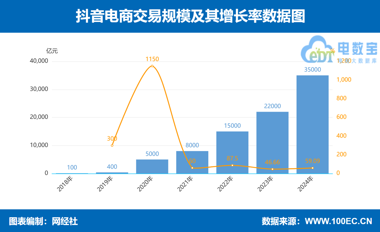 据“电数宝”电商大数据库显示,估算2024年抖音电商交易规模为3.5万亿元,增速为59.09%,呈现波动增长。