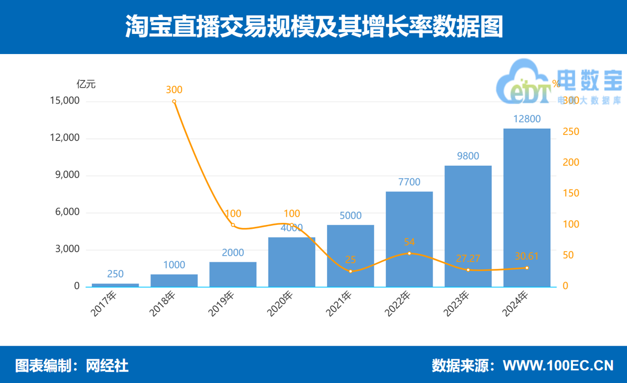 据“电数宝”电商大数据库显示,2024年淘宝直播交易规模为12800亿元,同比增长30.61%。