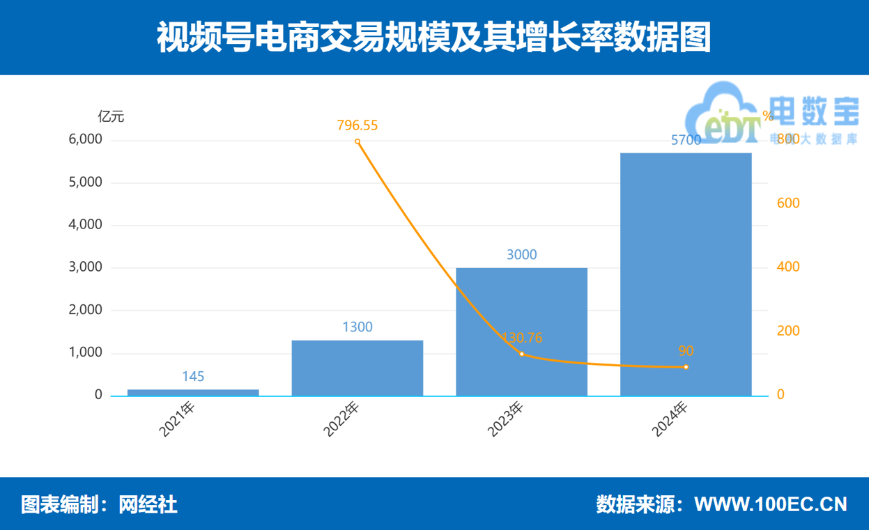 据 “电数宝”电商大数据库显示,2024全年视频号电商GMV为5700亿元,同比增长90%。