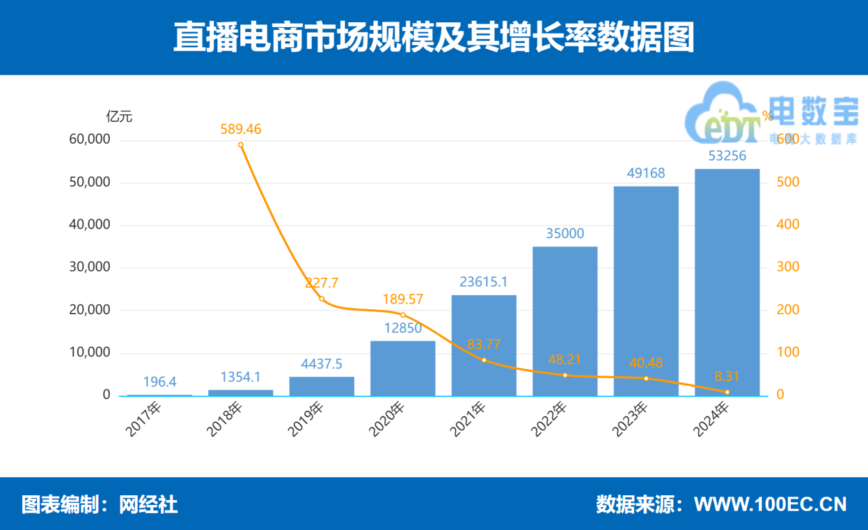 据网经社“电数宝”电商大数据库显示,2024年直播电商交易规模达到53256亿元,同比增长8.31%,增速明显下滑。