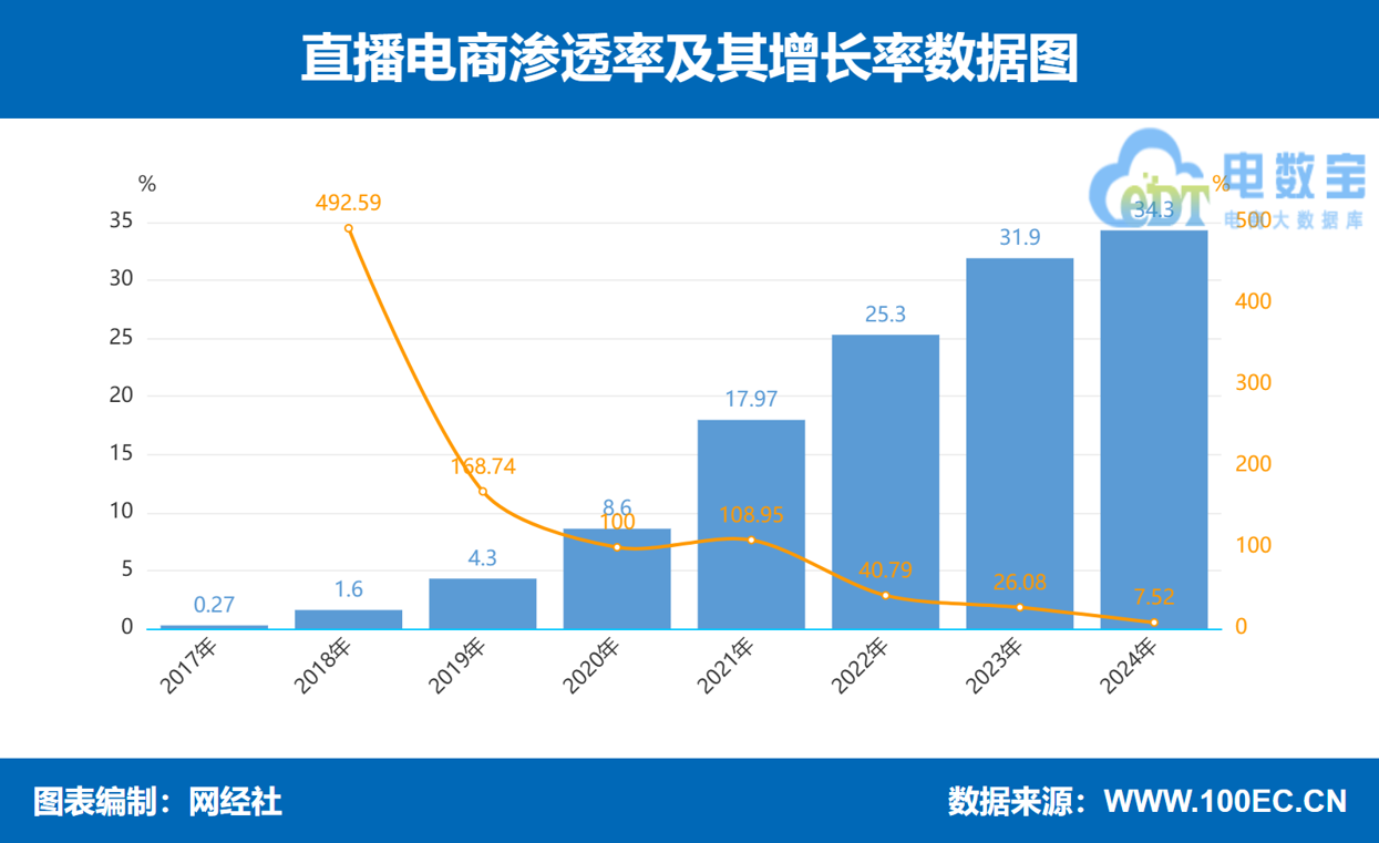 “电数宝” 显示,直播电商渗透率(直播电商渗透率=直播电商交易规模/网络零售交易规模)在2024年达34.3%,增长率为7.52%,增速继续下降。