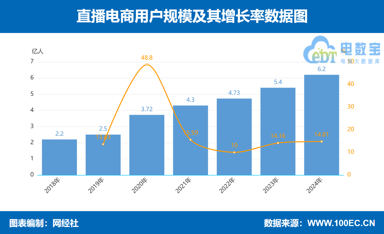 “电数宝” 显示,2024年直播电商用户规模达6.2亿人,同比增长14.81%,增速平稳上升。
