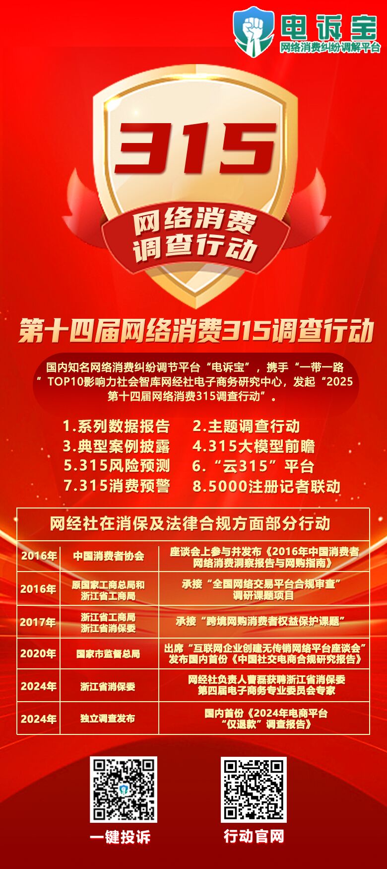 在2026年“3·15国际消费者权益日”来临之际,国内知名网络消费纠纷调节平台“电诉宝”正式启动年度重点活动——“2026第十五届网络消费315调查行动”。本次行动将携手“一带一路”TOP10影响力社会智库网经社电子商务研究中心,聚焦网络消费领域新痛点,以深入调查守护消费权益,助推行业品质升级。