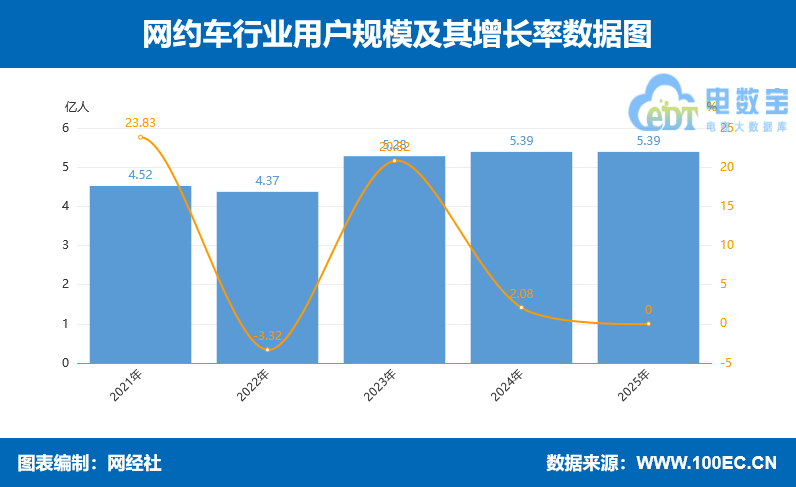 2025年网约车用户规模为5.39亿人,同比持平。