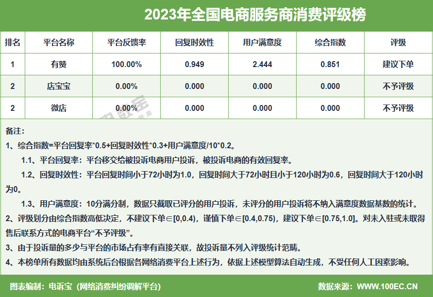 而在“2023年全国电商服务商消费评级榜”中,有赞获“建议下单”评级;店宝宝、微店获“不予评级”。