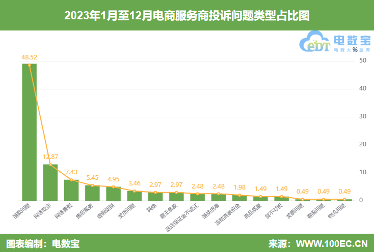 据“电诉宝”显示,2023年全国电商服务商用户投诉问题类型有:退款问题,占比最高,达48.52%;其次为网络欺诈,占比12.87%;排在第三的是网络售假,占比7.43%。此外,还有售后服务(5.45%)、虚假促销(4.95%)、发货问题(3.46%)、其他(2.97%)、霸王条款(2.97%)、退店保证金不还(2.48%)、退换货难(2.48%)、冻结商家资金(1.98%)、商品质量(1.49%)、货不对板(1.49%)、发票问题(0.49%)、客服问题(0.49%)、物流问题(0.49%)等问题。