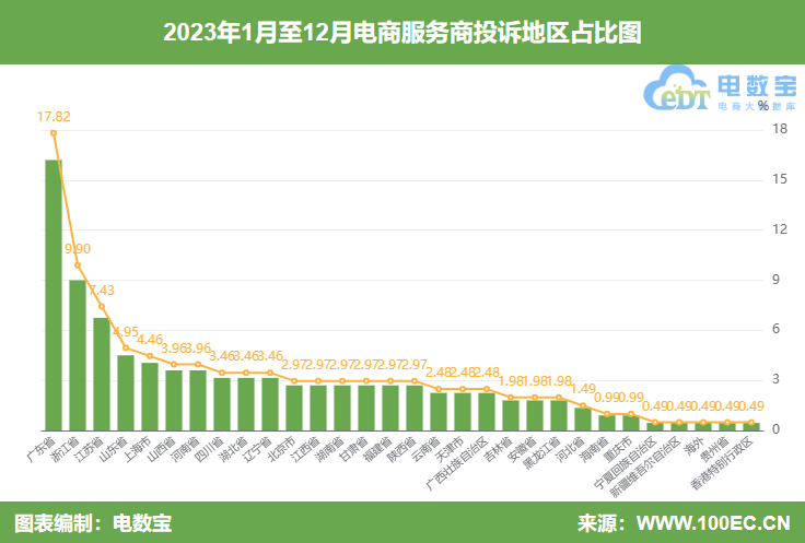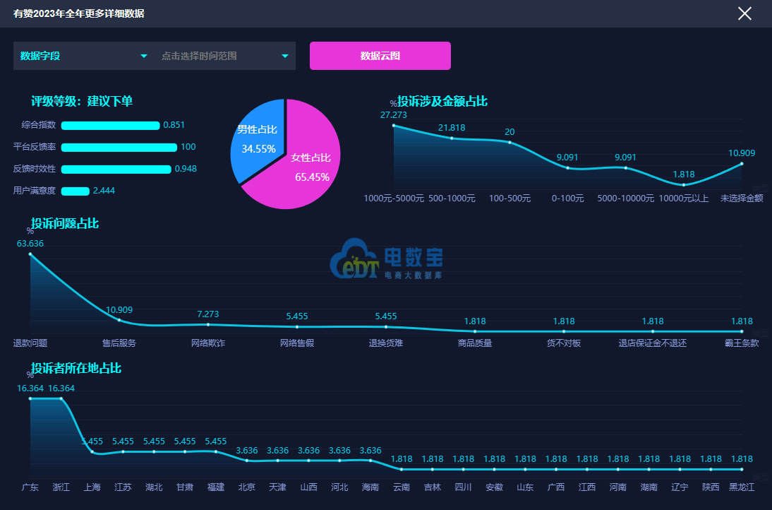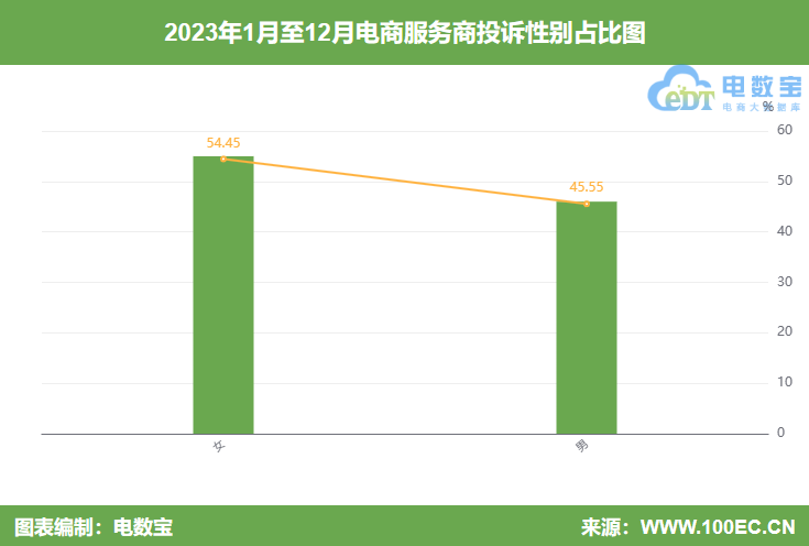 据“电诉宝”显示,电商服务商2023年男性用户投诉比例为45.55%,女性用户投诉比例为54.45%。