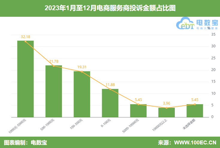据“电诉宝”显示,2023年电商服务商投诉金额分布主要集中在1000元-5000元(32.18%)、500-1000元(21.78%)、100-500元(19.31%)、0-100元(11.88%)、5000-10000(5.45%)、10000元以上(3.96%)、未选择金额(5.45%)。