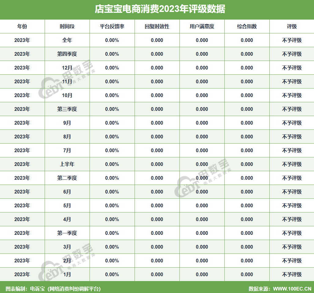 据网经社旗下电商大数据库“电数宝”监测数据显示,2023年“店宝宝”共获得18次消费评级,均为“不予评级”,2023年整体消费评级为“不予评级”。