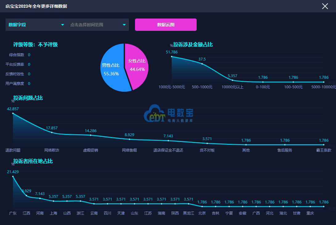 2023年“店宝宝”涉嫌存在退款问题、网络欺诈、虚假促销、网络售假、退店保证金不退还、货不对板、售后服务、霸王条款等问题;用户投诉“店宝宝”的消费金额主要在1000元-5000元、500-1000元、10000元以上、0-100元、100-500元、5000-10000元区间。