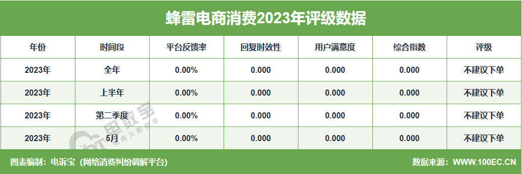据网经社旗下电商大数据库“电数宝”监测数据显示,2023年“蜂雷”共获得4次消费评级,均为“不建议下单”评级 。