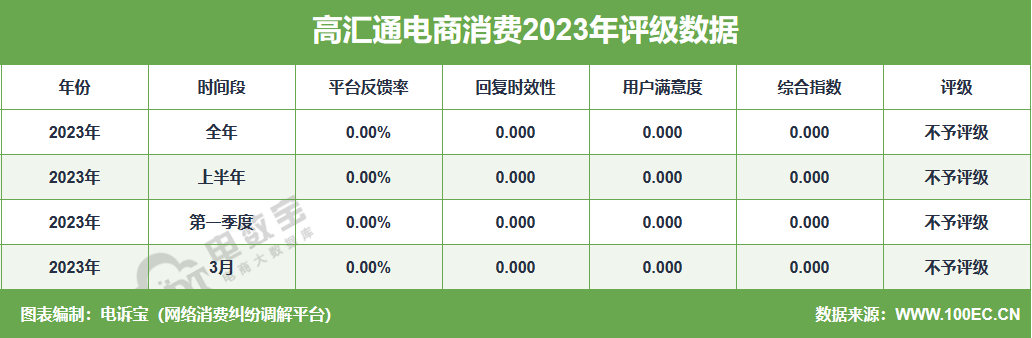 据网经社旗下电商大数据库“电数宝”监测数据显示,2023年“高汇通”共获得4次消费评级,均为“不予评级” 。