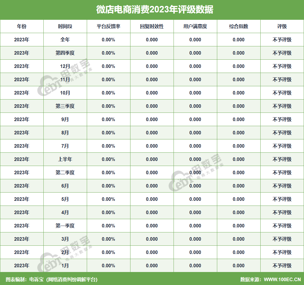 据网经社旗下电商大数据库“电数宝”监测数据显示,2023年“微店”共获得18次消费评级,均为“不予评级”,2023年整体消费评级为“不予评级” 。