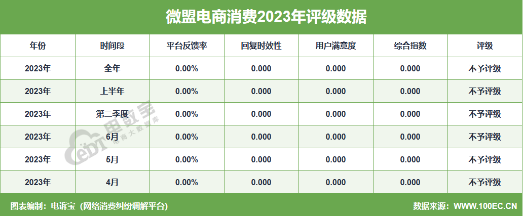 据网经社旗下电商大数据库“电数宝”监测数据显示,2023年“微盟”共获得6次消费评级,均为“不予评级” 。