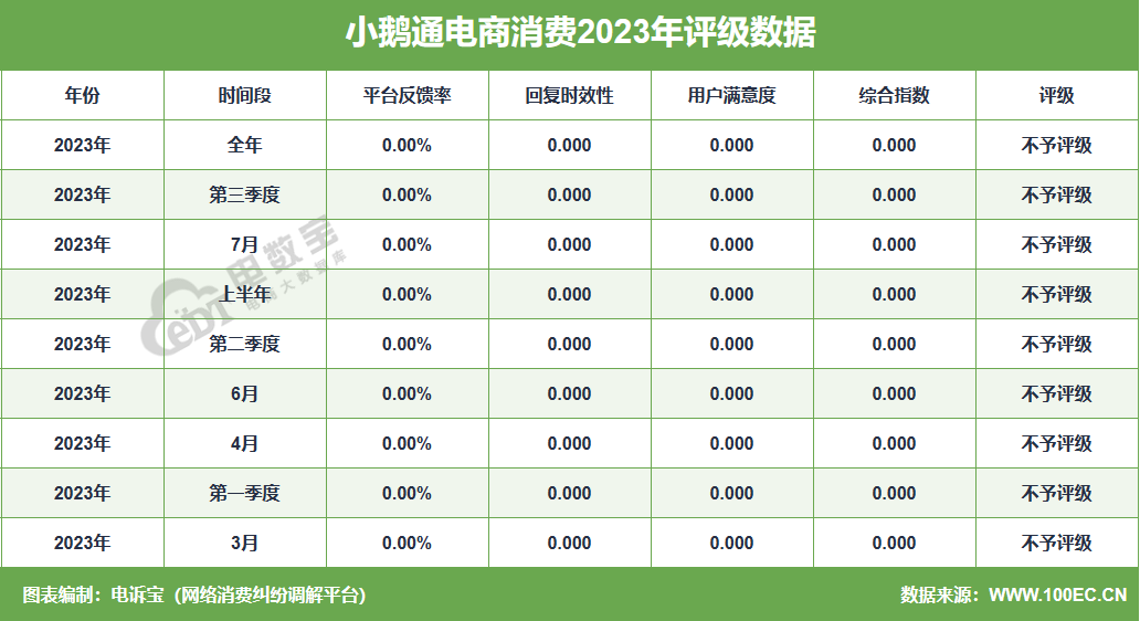 据网经社旗下电商大数据库“电数宝”监测数据显示,2023年“小鹅通”共获得9次消费评级,均为“不予评级” 。