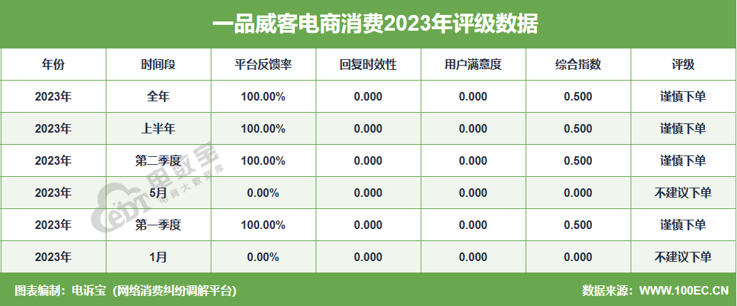 据网经社旗下电商大数据库“电数宝”监测数据显示,2023年“一品威客”共获得6次消费评级,4次获“谨慎下单”,2次获“不建议下单”评级,2023年整体消费评级为“谨慎下单” 。