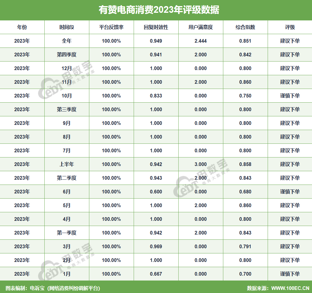 据网经社旗下电商大数据库“电数宝”监测数据显示,2023年“有赞”共获得18次消费评级,均为“建议下单”,2023年整体消费评级为“建议下单” 。