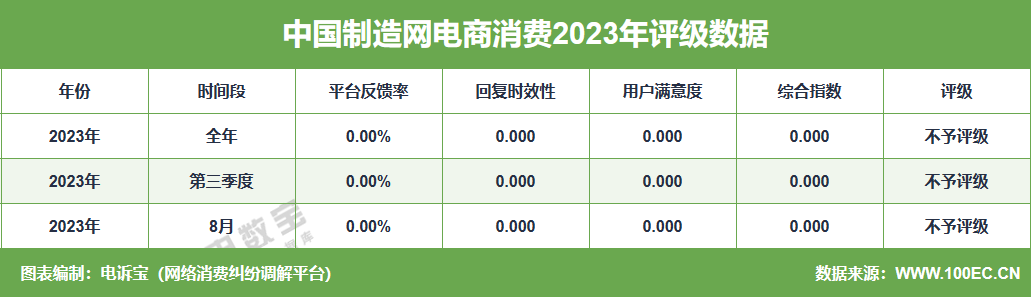 据网经社旗下电商大数据库“电数宝”监测数据显示,2023年“中国制造网”共获得3次消费评级,均为“不予评级” 。