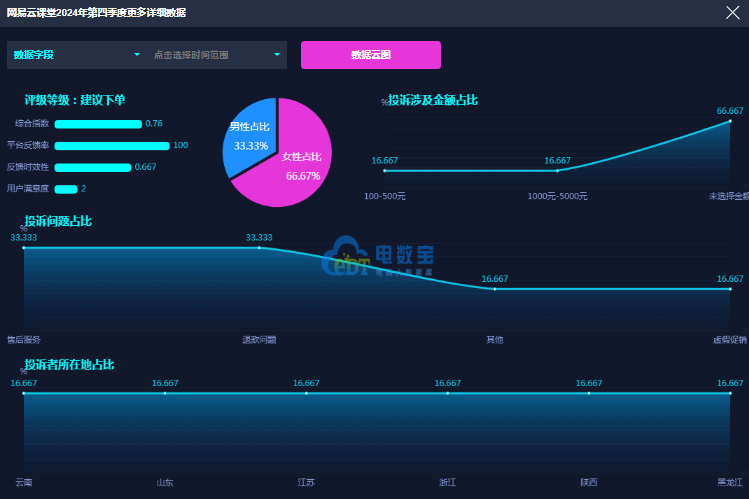 11月20日,山东省的霍女士向“电诉宝”投诉称其于7月31日在网易云课堂购买的一门公共营养师线上课程的问题。霍女士反映她是在网易云课堂的微信客服的指引下,于淘宝平台上完成了这门课程的购买。在购买之前,该微信客服并未清晰地向她说明该线上课程的有效期限制为一年。成功购买并兑换课程后,才发现这一有效期限制。