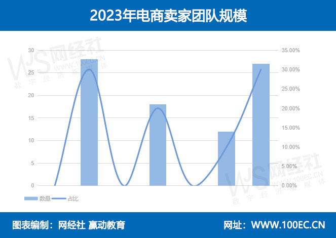 被调查企业中,各企业电子商务团队规模区间段中,企业电子商务团队规模在30人以内和100人以上的占比略高,达30%