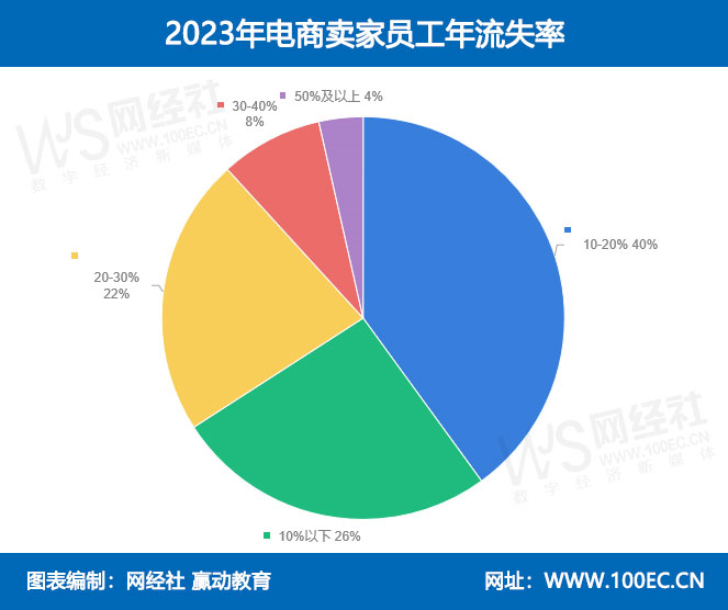 各企业在2023年的员工流失率区间段中,20%-30%区间段占比为22%,10%-20%,占比达40%,
