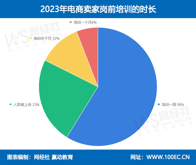 各企业岗前培训的时长区间段中,培训一周的占比占总体的59%,入职就上岗的占比占总体的23%,培训半个月的占比占总日的12%