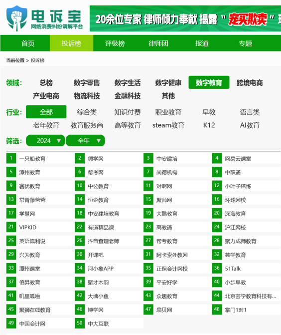 根据“电诉宝”2024年受理的中国数字教育领域用户有效投诉显示,入选投诉榜TOP10有:一只船教育、中安建培、网易云课堂、潭州教育、帮考网、尚德机构、中职通、赛优教育、中公教育;